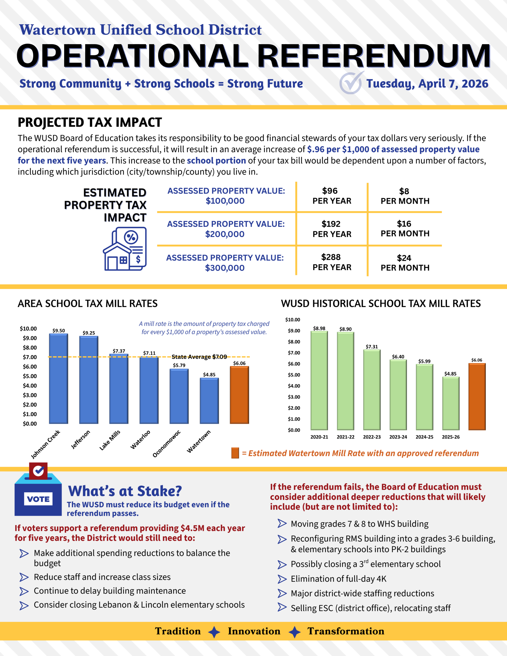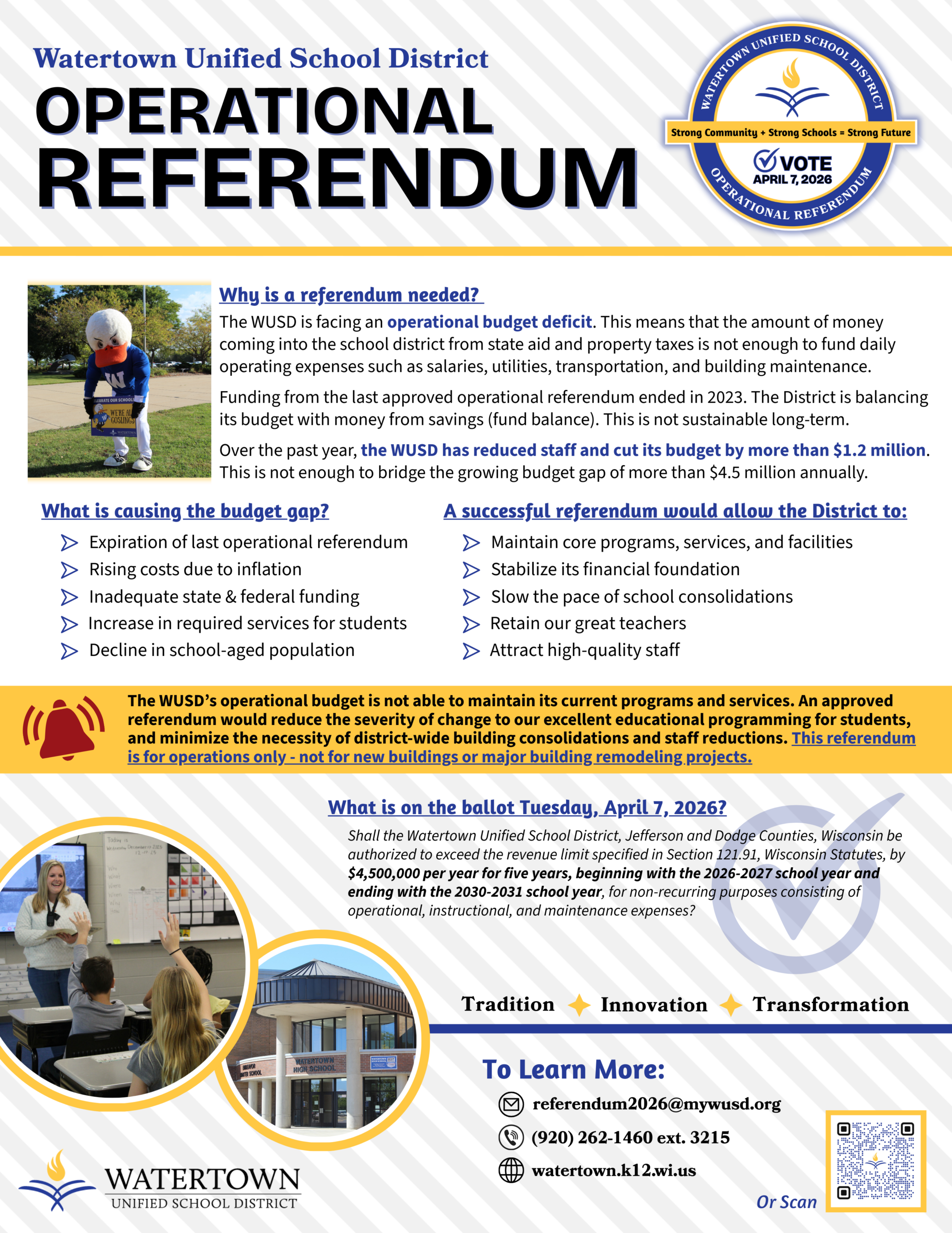 The Watertown Unified School District consists of five elementary schools, one middle school and one high school. All schools are staffed by highly qualified educators and support personnel who care deeply about our students and their well-being.