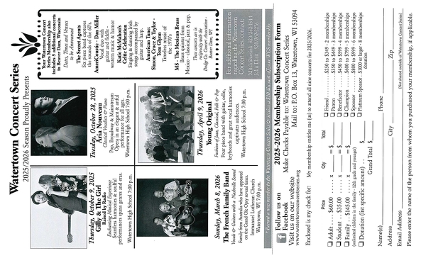 Our mission: To make the experience and magic of live professional musical performances to every man, woman, and child in the Watertown (WI) area, and to provide musical outreach programs for young people.