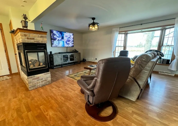 Families are invited to create lasting memories while enjoying a movie by the fireplace in this charming rental home. Guests can spend their days fishing and taking in the beautiful views of the Rock River. During the winter, the property is conveniently located near the Jefferson County Snowmobile trails, which are also used for ATVs in the spring. Additionally, several bike trails can be found in town. Those looking for activities can visit the Octagon House or explore local antique shops and outlet malls. When it comes to dining, the area is known for its famous Wisconsin supper clubs.