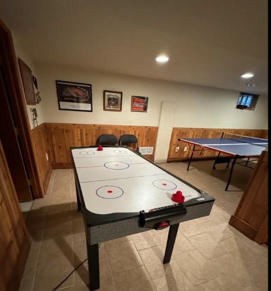 The space features a spacious great room equipped with a game table and a dining area, as well as a 75" HD TV. Upstairs, there are two bedrooms with queen beds and a full bath. The downstairs includes a bedroom with twin beds and a bathroom with a shower. In the basement, guests will find a ping-pong table and an air hockey table. The house also offers a fully equipped kitchen with stainless steel appliances and a washer and dryer for convenience.