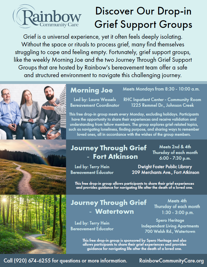 Rainbow Community Care is now offering a new evening support group entitled "Journey Through Grief." This group meets on the second and fourth Thursday of each month at the Dwight Foster Public Library (209 Merchants Ave., Fort Atkinson) from 6 p.m. to 7:30 p.m.