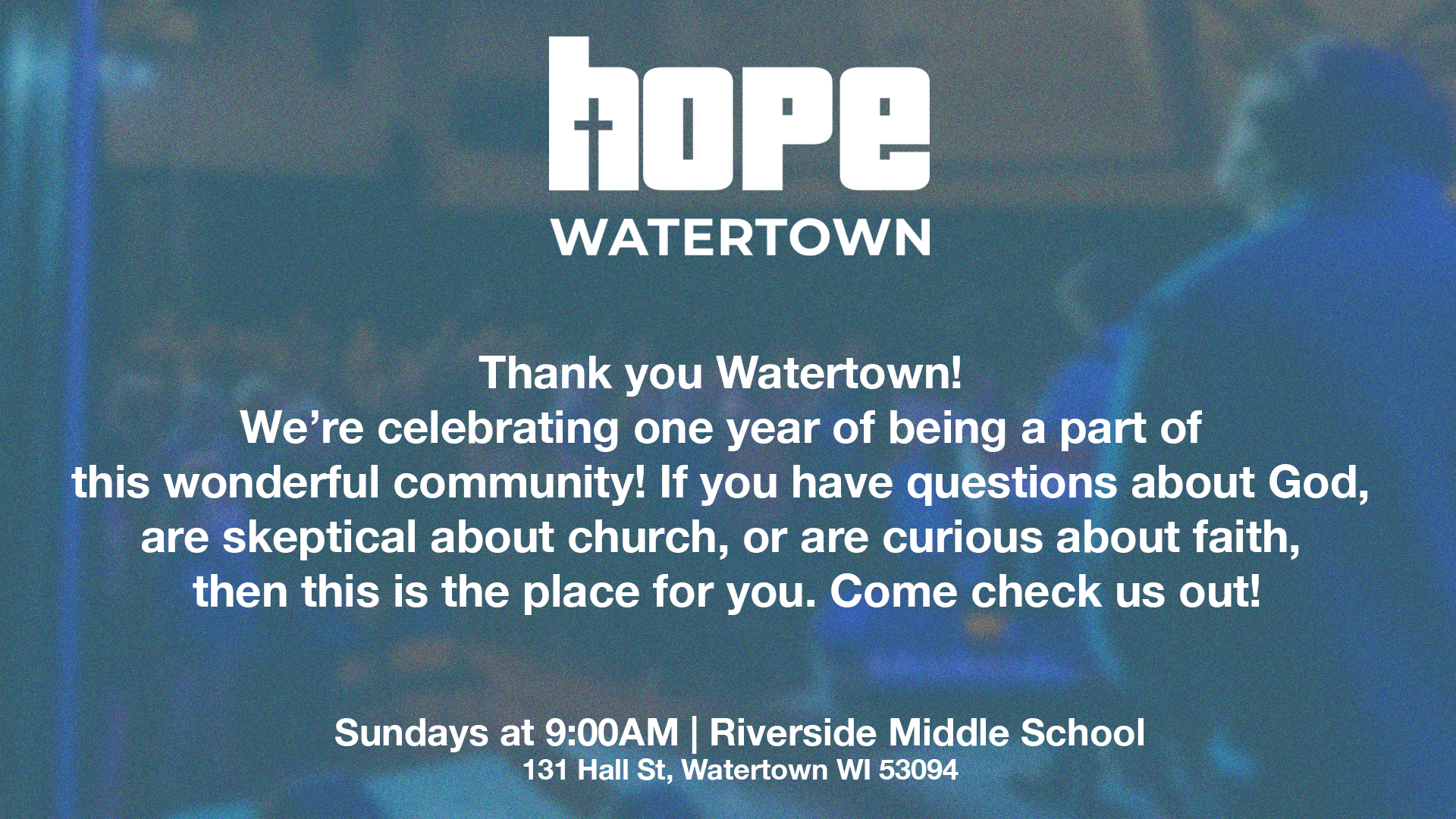Happy 1st Anniversary to Hope Church! Join in congratulating the Hope Church team! You can help them celebrate their first year in person this coming Sunday, February 8th at 9 AM at Riverside Middle School.
