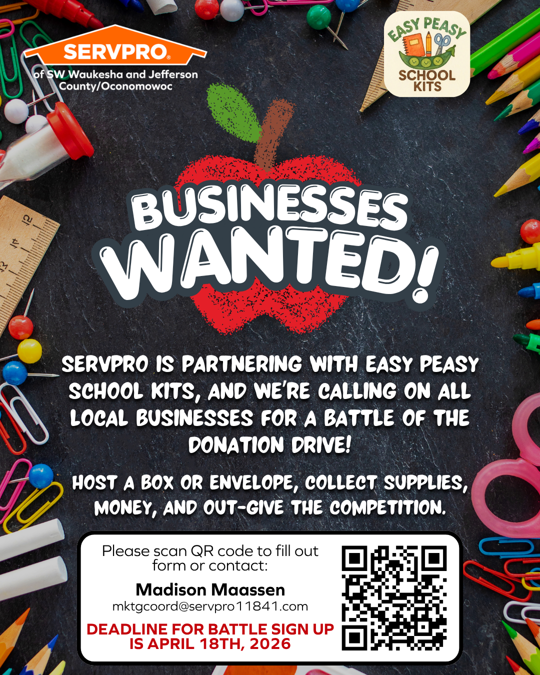 ServPro is teaming up with Easy Peasy School Kits. They need Local Business like YOU for a battle of the donations drive! Would you like to host a box, envelope, collect supplies, money, and out-give the competition? |